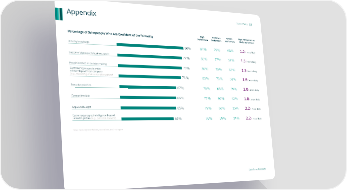 State of Sales 53 Appendix High Moderate Under- High Performers vs. Percentage of Salespeople Who Are Confident of the Following Performers Performers performers Underperformers Industry knowledge 80% 84% 79% 68% 1.2x more likely Customer’s/prospect’s business needs 77% 85% 77% 57% 1.5x more likely People involved in decision-making 76% 86% 75% 58% 1.5x more likely Customer’s/prospect’s entire relationship with our company (e.g., marketing and service interactions) 74% 83% 73% 52% 1.6x more likely Executive priorities 67% 76% 66% 39% 2.0x more likely Competitive bids 66% 77% 65% 42% 1.8x more likely Approved budget 65% 79% 63% 35% 2.2x more likely Customer/prospect intelligence beyond LinkedIn profiles (e.g., personal interests) 61% 76% 59% 34% 2.2x more likely Base: Sales representatives, executives, and managers Salesforce Research