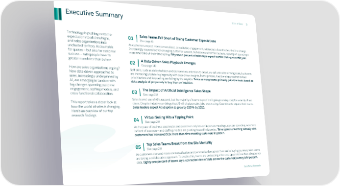 Executive Summary StaStatte oe of Salesf Sales 55 Technology is pushing customer 01 Sales Teams Fall Short of Rising Customer Expectations expectations to all-time highs, (See page 6) and sales organizations into As customers expect more personalized, consultative engagement, salespeople bear the brunt of the change. uncharted territory. Accountable Increasingly responsible for emerging customer success, but also overwhelmed by tasks, reps report spending a for quotas — but also for customer mere one-third of their time selling. Fifty-seven percent of sales reps expect to miss their quotas this year. success — salespeople have far greater mandates than before. 02 A Data-Driven Sales Playbook Emerges (See page 11) How are sales organizations coping? Soft skills, such as ability to listen and demonstrate attention to detail, are still critical to winning deals, but teams New data-driven approaches to are increasingly bolstering ingenuity with data-driven insights. In the process, traditional approaches to lead sales, increasingly underpinned by prioritization and forecasting are falling by the wayside. Twice as many teams primarily prioritize leads based on AI, are emerging in tandem with data analysis of propensity to buy than on intuition. big changes spanning customer engagement, staffing models, and 03 The Impact of Artificial Intelligence Takes Shape cross-functional collaboration. (See page 15) This report takes a closer look at Sales teams’ use of AI is nascent, but the majority of teams expect it will gain ground quickly for a variety of use cases. Despite industry rumblings that AI will displace sales jobs, those using AI continue to expand their teams. how the world of sales is changing. Sales leaders expect AI adoption to grow by 155% by 2020. Here’s an overview of our top research findings. Virtual Selling Hits a Tipping Point 04 (See page 20) As the pace of business accelerates and customers rely less on in-person meetings, reps are spending more time in front of a screen — and staffing models are pivoting toward inside roles. Time spent connecting virtually with customers has increased 3.2x more than time meeting customers in person. 05 Top Sales Teams Break from the Silo Mentality (See page 23) As customers demand more contextualization and personalization across their entire buying journeys, sales teams are taking a collaborative approach. To enable this, teams are embracing a free and open internal flow of customer data. Eighty-one percent of teams say a connected view of data across the customer journey is important. Salesforce Research