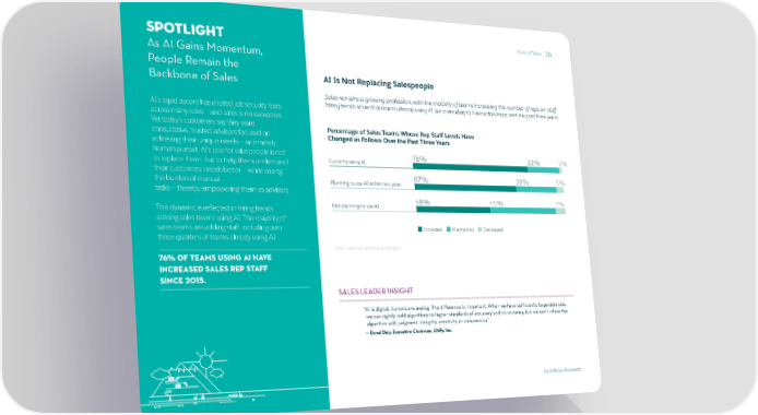 Spotlight State of Sales 16 As AI Gains Momentum, People Remain the Backbone of Sales AI Is Not Replacing Salespeople Sales remains a growing profession, with the majority of teams increasing the number of reps on staff. AI’s rapid ascent has elicited job security fears Hiring trends show that teams already using AI are more likely to have added reps over the past three years. across many roles — and sales is no exception. Yet today’s customers say they want Percentage of Sales Teams Whose Rep Staff Levels Have consultative, trusted advisors focused on Changed as Follows Over the Past Three Years achieving their unique needs — an innately human pursuit. AI’s role for salespeople is not 76% 22% 3% to replace them, but to help them understand Currently using AI their customers’ needs better — while easing 67% 28% 5% the burden of manual Planning to use AI within two years tasks — thereby empowering them as advisors. Not planning to use AI 48% 45% 7% This dynamic is reflected in hiring trends among sales teams using AI. The majority of sales teams are adding staff, including over Increased Maintained Decreased three-quarters of teams already using AI. Base: Sales executives and managers 76% of teams using AI have increased sales rep staff since 2015. SALES LEADER INSIGHT “AI is digital, humans are analog. The difference is important. When we have sufficiently large data sets, we can rightly hold algorithms to higher standards of accuracy and consistency, but we can’t infuse the algorithm with judgment, integrity, creativity or compassion.” — Donal Daly, Executive Chairman, Altify, Inc. Salesforce Research