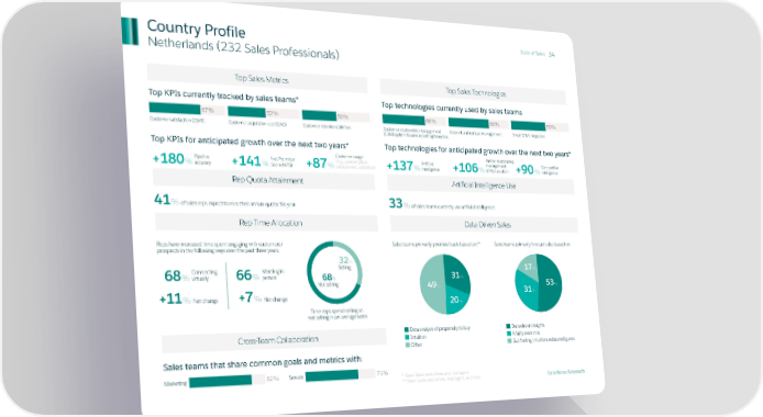 Country Profile State of Sales 34 Netherlands (232 Sales Professionals) Top Sales Metrics Top Sales Technologies Top KPIs currently tracked by sales teams* Top technologies currently used by sales teams 67% 52% 50% 66% 66% 59% Customer satisfaction (CSAT) Customer acquisition cost (CAC) Customer retention/attrition Customer relationship management Account and contact management Email/CRM integration (CRM) system & sales reporting/analytics Top KPIs for anticipated growth over the next two years* Top technologies for anticipated growth over the next two years* rtner relationship Customer usage Pa Pipeline Net Promoter (e.g., consumption, Artificial management Competitive +180%accuracy +141%Score (NPS) +87%deployment, utilization) +137%intelligence +106%(PRM) solution +90%intelligence Rep Quota Attainment Artificial Intelligence Use 41%of sales reps expect to miss their annual quota this year 33%of sales teams currently use artificial intelligence Rep Time Allocation Data-Driven Sales Reps have increased time spent engaging with customers/ Sales teams primarily prioritize leads based on:** Sales teams primarily forecast sales based on: prospects in the following ways over the past three years: 32% Connecting Meeting in Selling 17% 68%virtually 66%person 68% 31% Not selling 49% 53% +11%Net change +7%Net change 31% 20% Time reps spend selling vs. not selling in an average week Cross-Team Collaboration Data analysis of propensity to buy Data-driven insights Intuition A fairly even mix Other Gut feeling, intuition, educated guess Sales teams that share common goals and metrics with: Marketing 82% Service 75% * Base: Sales executives and managers ** Base: Sales executives, managers, and reps Salesforce Research