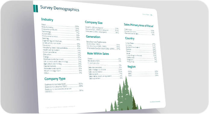 Survey Demographics State of Sales 56 * Industry Company Size Sales Primary Area of Focus Retail .......................................................................21% Small (1–100 employees) .................................27% Inside sales ............................................................52% Manufacturing ......................................................11% Medium (101–3,500 employees) ...................57% Outside/field sales ...............................................41% Consumer products ............................................10% Enterprise (3,501+ employees) ........................15% Channel/partner sales .......................................... 6% Technology .............................................................. 7% Automotive .............................................................. 6% Generation Country Professional services .............................................. 6% Banking ..................................................................... 6% Engineering, architecture, Baby Boomers/Traditionalists United States .........................................................17% construction, real estate ....................................... 6% (born before 1964)..............................................15% Germany ................................................................11% Insurance ................................................................. 5% Gen Xers (born 1965–1980) ............................48% Australia/New Zealand .......................................10% Hospitality, travel, transportation......................... 4% Millennials/Gen Zers (born 1981–1999).......37% Canada ...................................................................10% Healthcare (provider) ............................................ 3% France .....................................................................10% Communications ................................................... 3% Role Within Sales Japan ......................................................................10% Education ................................................................. 2% United Kingdom/Ireland ....................................10% Energy ....................................................................... 2% Netherlands ............................................................. 8% Media and entertainment .................................... 2% Owner ....................................................................... 4% Singapore ................................................................. 7% Life sciences and biotechnology ......................... 2% President or CEO .................................................... 2% Hong Kong ............................................................... 6% Agriculture and mining ......................................... 1% C-level executive Capital markets ....................................................... 1% (CIO, CTO, COO, CMO, etc.) ................................ 3% Region Recreation and sports ........................................... 1% Sales vice president................................................ 8% Wealth management ............................................ 1% Sales manager or director ..................................32% Other ......................................................................... 3% Sales representative .............................................31% EMEA ......................................................................40% Sales support ........................................................... 7% APAC .......................................................................33% Sales trainer, coach, or equivalent ...................... 2% NAM ........................................................................28% Company Type Sales operations ..................................................... 9% Business-to-business (B2B) ................................32% Business-to-consumer (B2C) .............................38% Business-to-business-to-consumer (B2B2C) ..................................................................31% * Base: Sales representatives, managers, and support SalesforSalesforcce Re Researesearchch