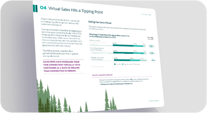 Virtual Sales Hits a Tipping Point State of Sales 20 04 Despite being overloaded with tasks, salespeople Selling Has Gone Virtual are making a big effort to spend more time with customers and prospects. Time spent meeting with customers virtually has increased at a rate over three times that of meeting in person. In an era of constant connectivity, the biggest gains are in time spent connecting virtually. In fact, 60% Percentage of Sales Reps Who Spend More or Less Time Net Change of reps report an increase in virtual meetings over on the Following Compared to 2015 Since 2015 the last three years. What’s more, there are three In front of a screen times as many sales reps who now spend less time (i.e., time on a computer, tablet, 62% 30% 8% with customers in person than there are those who or smartphone) +12% spend less time with them virtually. Connecting virtually with customers/prospects 60% 32% 8% This shifting dynamic coincides with a (e.g., via Hangouts, Skype, email, etc.) +12% general trend toward screen time, in general, among salespeople. Meeting in person with 48% 30% 23% customers/prospects +4% Sales reps have increased their time connecting virtually with Increased Stayed the same Decreased customers at a rate 3x greater Base: Sales representatives than connecting in person. SALES LEADER INSIGHT “Among the many factors driving the increase in virtual selling, buyer preference stands out. Buyers are digital-first and don’t feel the need for face-to-face communication.” — Trish Bertuzzi, President & Chief Strategist, The Bridge Group Salesforce Research