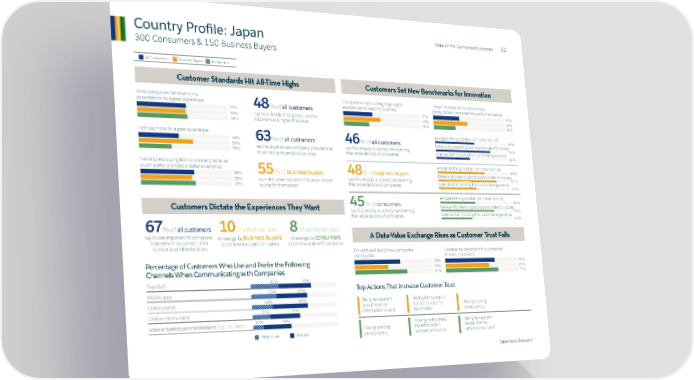 State of the Connected Customer Country Profile: Japan 32 300 Consumers & 150 Business Buyers All Customers Business Buyers Consumers Customer Standards Hit All-Time Highs Customers Set New Benchmarks for Innovation Most companies fall short of my Companies need cutting-edge digital I expect companies to provide new expectations for a great experience 48% of all customers experiences to keep my business products/services more frequently than before 53% 37% 36% 52% say their standard for good customer 47% 47% 54% experiences is higher than ever 32% 30% I will pay more for a great experience recognize the good that can come from AI 43% 63% of all customers 46% of all customers 54% 59% believe AI presents good opportunities for society say the experience a company provides is as say AI is already or actively transforming 76% 35% important as its products/services their expectations of companies open to AI improving the customer experience 46% I’ve stopped buying from a company because recognize the good that can come from AI a competitor provided a better experience 55% of business buyers 48% of business buyers 65% 58% believe AI presents good opportunities for society 55% want the same experience as when they’re say AI is already or actively transforming 81% 59% their expectations of companies open to AI improving the customer experience buying for themselves 52% recognize the good that can come from AI 45% of consumers 48% Customers Dictate the Experiences They Want believe AI presents good opportunities for society say AI is already or actively transforming 74% their expectations of companies open to AI improving the customer experience 67% of all customers 10 channels are used, 8 channels are used, 42% say it’s very important for companies on average, by business buyers on average, by consumers A Data-Value Exchange Rises as Customer Trust Falls to treat them as a person, not a to communicate with companies to communicate with companies number, to win their business I’m confused about how companies I believe my personal info is vulnerable use my data to a security breach Percentage of Customers Who Use and Prefer the Following 58% 68% Channels When Communicating with Companies 42% 60% 66% 72% Text/SMS 32% 70% Mobile apps 29% 65% Top Actions That Increase Customer Trust Online portals 24% 65% Being transparent Asking for my explicit 20% about how my consent to use my Having a strong Online communities 55% information is used information privacy policy Voice-activated personal assistants (e.g., Siri, Alexa) 12% 44% Vowing not to share Being transparent Having a strong my information about how my Prefer to use Total use privacy policy without permission information is used Salesforce Research