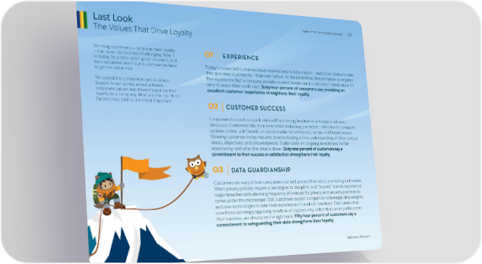 Last Look StaStatte oe of the Cf the Conneconnectted Ced Cuuststomeromer 2222 The Values That Drive Loyalty Winning customers — let alone their loyalty 01 EXPERIENCE — has never been more challenging than it is today. In a time when great products and services alone won’t cut it, companies have Today’s connected customers have more access to information — and more choice in who to go the extra mile. they give their business to — than ever before. At the same time, they’re harder to impress. We asked the consumers and business The experience that a company provides is what stands out in customers’ minds when it’s buyers in our survey about a dozen time to swipe their credit card. Sixty-four percent of customers say providing an corporate values and their impact on their excellent customer experience strengthens their loyalty. loyalty to a company. Here are the top three factors they told us are most important. 02 CUSTOMER SUCCESS Companies focused on quick sales will face strong headwinds in today’s customer landscape. Customers take their time when evaluating purchases — whether to compare options online, ask friends on social media for references, or use a different device. Winning customers today requires demonstrating a firm understanding of their unique needs, objectives, and circumstances. It also takes an ongoing investment in the relationship well after the deal is done. Sixty-one percent of customers say a commitment to their success or satisfaction strengthens their loyalty. 03 DATA GUARDIANSHIP Customers are wary of how companies use and protect their data, and with good reason. When privacy policies require a law degree to decipher, and “trusted” brands experience major breaches with alarming frequency, it’s natural for privacy and security practices to come under the microscope. Still, customers expect companies to leverage data insights and new technologies to take their experiences to a whole new level. Companies that view these seemingly opposing trends as an opportunity, rather than an impediment to their business, are already on the right track. Fifty-four percent of customers say a commitment to safeguarding their data strengthens their loyalty. Salesforce Research Salesforce Research