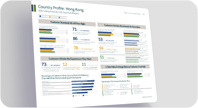State of the Connected Customer Country Profile: Hong Kong 30 300 Consumers & 150 Business Buyers All Customers Business Buyers Consumers Customer Standards Hit All-Time Highs Customers Set New Benchmarks for Innovation Most companies fall short of my Companies need cutting-edge digital I expect companies to provide new expectations for a great experience 71% of all customers experiences to keep my business products/services more frequently than before 48% 61% 76% 44% say their standard for good customer 69% 79% 49% experiences is higher than ever 57% 74% I will pay more for a great experience recognize the good that can come from AI 61% 86% of all customers 53% of all customers 73% 61% believe AI presents good opportunities for society say the experience a company provides is as say AI is already or actively transforming 61% 60% important as its products/services their expectations of companies open to AI improving the customer experience 63% I’ve stopped buying from a company because recognize the good that can come from AI a competitor provided a better experience 78% of business buyers 59% of business buyers 75% 51% believe AI presents good opportunities for society 45% want the same experience as when they’re say AI is already or actively transforming 63% 54% their expectations of companies open to AI improving the customer experience buying for themselves 67% recognize the good that can come from AI 51% of consumers 72% Customers Dictate the Experiences They Want believe AI presents good opportunities for society say AI is already or actively transforming 61% their expectations of companies open to AI improving the customer experience 73% of all customers 12 channels are used, 11 channels are used, 61% say it’s very important for companies on average, by business buyers on average, by consumers A Data-Value Exchange Rises as Customer Trust Falls to treat them as a person, not a to communicate with companies to communicate with companies number, to win their business I’m confused about how companies I believe my personal info is vulnerable use my data to a security breach Percentage of Customers Who Use and Prefer the Following 61% 70% Channels When Communicating with Companies 49% 63% 67% 74% Mobile apps 64% 94% Online portals 46% 91% Top Actions That Increase Customer Trust Online communities 39% 88% Showing a commitment Vowing not to share 38% to protecting my Tie my information Having a strong Text/SMS 82% information without permission privacy policy Voice-activated personal assistants (e.g., Siri, Alexa) 19% 62% Vowing not to share Giving me control my information Tie Having a strong over what information Prefer to use Total use without permission privacy policy is collected about me Salesforce Research