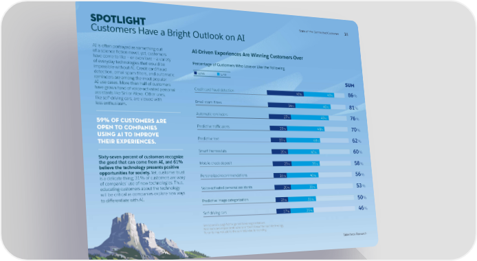 SPOTLIGHT StaStatte oe of the Cf the Conneconnectted Ced Cuuststomeromer 1818 Customers Have a Bright Outlook on AI AI is often portrayed as something out AI-Driven Experiences Are Winning Customers Over of a science fiction novel, yet, customers have come to like — or even love — a variety Percentage of Customers Who Love or Like the Following of everyday technologies that would be impossible without AI. Credit card fraud Love Like detection, email spam filters, and automatic Sum reminders are among the most popular AI use cases. More than half of customers Credit card fraud detection 86% have grown fond of voice-activated personal 46% 40% assistants like Siri or Alexa. Other uses, like self-driving cars, are viewed with Email spam filters 34% 46% 81% less enthusiasm. Automatic reminders 27% 49% 76% 59% of customers are open to companies Predictive traffic alerts 21% 48% 70% using AI to improve Predictive text their experiences. 19% 43% 62% Smart thermostats 20% 40% 60% Sixty-seven percent of customers recognize the good that can come from AI, and 61% Mobile check deposit 23% 36% 58% believe the technology presents positive opportunities for society. Yet, customer trust is a delicate thing; 31% of customers are wary Personalized recommendations 16% 40% 56% of companies’ use of new technologies. Thus, educating customers about the technology Voice-activated personal assistants 20% 33% 53% will be critical as companies explore new ways to differentiate with AI. Predictive image categorization 15% 35% 50% Self-driving cars 17% 29% 46% See appendix page 50 for generational segmentations. Base excludes respondents who said “Don’t Know” for each technology. Percents may not add to the sum total due to rounding. Salesforce Research Salesforce Research