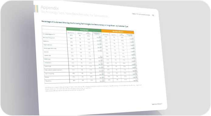 State of the Connected Customer Appendix 51 Technology Sets New Benchmarks for Innovation Percentage of Customers Who Say the Following Technologies Are Revolutionary or Insignificant, by Customer Type Consumers Business Buyers Net Revolutionary vs. Net Revolutionary vs. Revolutionary Insignificant Difference Insignificant Revolutionary Insignificant Difference Insignificant Artificial intelligence (AI) 32% 3% 29% 9.7x 34% 4% 31% 9.1x more likely more likely Internet of Things (IoT) 28% 4% 24% 7.3x 31% 4% 27% 7.4x more likely more likely Blockchain 19% 5% 14% 4.1x 24% 5% 19% 4.8x more likely more likely Cryptocurrencies 18% 8% 11% 2.4x 20% 8% 12% 2.6x more likely more likely Virtual/augmented reality 22% 9% 13% 2.4x 26% 7% 19% 3.7x more likely more likely Chatbots 14% 14% 0% — 20% 11% 9% 1.8x more likely Cybersecurity 23% 2% 21% 10.2x 28% 3% 25% 10.1x more likely more likely Mobile apps 29% 4% 25% 6.9x 31% 4% 27% 8.4x more likely more likely Smartphones 44% 2% 41% 18.3x 40% 3% 38% 14.9x more likely more likely Social media 20% 8% 12% 2.6x 24% 6% 18% 3.9x more likely more likely Voice-activated personal assistants 21% 9% 12% 2.4x 24% 7% 17% 3.3x more likely more likely Cloud computing 29% 3% 26% 9.9x 31% 3% 29% 11.8x more likely more likely Drones 26% 6% 20% 4.2x 26% 5% 21% 4.8x more likely more likely 3D printing 38% 4% 34% 9.9x 36% 4% 31% 8.1x more likely more likely Net difference is based on the percentage of respondents viewing a technology as revolutionary and those viewing it as insignificant using the following formula: (revolutionary - insignificant). Respondents were not required to rate a technology as revolutionary or insignificant. Data is based off respondents who elected to rate a technology as such. Salesforce Research