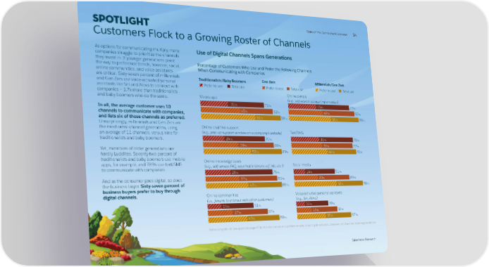 SPOTLIGHT StaStatte oe of the Cf the Conneconnectted Ced Cuuststomeromer 1414 Customers Flock to a Growing Roster of Channels As options for communicating multiply, many Use of Digital Channels Spans Generations companies struggle to prioritize the channels they invest in. If younger generations point Percentage of Customers Who Use and Prefer the Following Channels the way to preference trends, however, social, When Communicating with Companies online communities, and voice assistants are critical. Sixty-seven percent of millennials Traditionalists/Baby Boomers Gen Xers Millennials/Gen Zers and Gen Zers use voice-activated personal Prefer to use Total use Prefer to use Total use Prefer to use Total use assistants like Siri and Alexa to connect with companies — 1.7x more than traditionalists Online portals and baby boomers who do the same. Mobile app (e.g., self-service account information) 31% 72% 35% % 77 In all, the average customer uses 10 45% 82% 42% 83% channels to communicate with companies, 61% 90% 51% 88% and lists six of those channels as preferred. Unsurprisingly, millennials and Gen Zers are the most omni-channel generation, using Online chat/live support an average of 11 channels, versus nine for (e.g., pop-up support window on a company’s website) Text/SMS traditionalists and baby boomers. 24% 70% 35% 78% 39 80 38 77 Yet, members of older generations are % % % % 53% % 44% % hardly Luddites. Seventy-two percent of 89 81 traditionalists and baby boomers use mobile Online knowledge bases apps, for example, and 78% use text/SMS (e.g., self-service FAQ, searchable libraries of info, etc.) Social media to communicate with companies. 28% 76% 14% 51% % % % % And as the consumer goes digital, so does 37 81 29 69 the business buyer. Sixty-seven percent of 47% 86% 52% 86% business buyers prefer to buy through digital channels. Online communities Voice-activated personal assistants (i.e., forums to interact with other customers) (e.g., Siri, Alexa) 15 51 10 39 % % % % 27% 67% 18% 50% 80 67 43% % 35% % Not a complete list. See appendix page 47 for full channel use and preference data, including all customer, consumer, and business buyer segmentations. Salesforce Research Salesforce Research