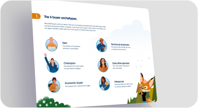 1. TThehe 6 6 b buuyyeerr a arrcchehettyyppeses.. Most B2B buyers don't act alone. They sit on a buying committee that will collectively make purchase decisions for their company. If you know your buyer’s role on that committee, you can figure out their needs and how much power or interest they may have. User Technical evaluator The person who operates The person who installs, secures, whatever is purchased or maintains the product Champion Executive sponsor The person who most wants The most senior member of the purchase to happen the committee Economic buyer Influencer The person who controls the budget Someone without a direct say but whose opinion matters