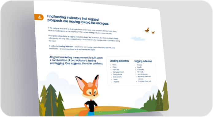4. Find leading indicators that suggest prospects are moving toward the end goal. If the end goal is to drive sales-accepted leads and it takes most prospects 60 days to get there, what do marketers do in the meantime? This is where leading indicators come into play. Most goals will probably be lagging indicators closely tied to revenue, but those numbers change infrequently and only after an opportunity is won or lost. It’s like trying to drive a car without seeing the road. If we look at leading indicators — short-term, fast-moving metrics like clicks, form fills, and lead scores — you can see where leads are headed and adjust. All good marketing measurement is built upon a combination of two indicators: leading Leading indicators Lagging indicators and lagging. One suggests, the other confirms. • Views • Revenue • Clicks • Upsells • Form fills • Cross-sells • Campaign reach • Renewals • Send volume • Acts of advocacy • Conversions • Marketing-attributed • Leads revenue • Pipeline • Customer churn rate