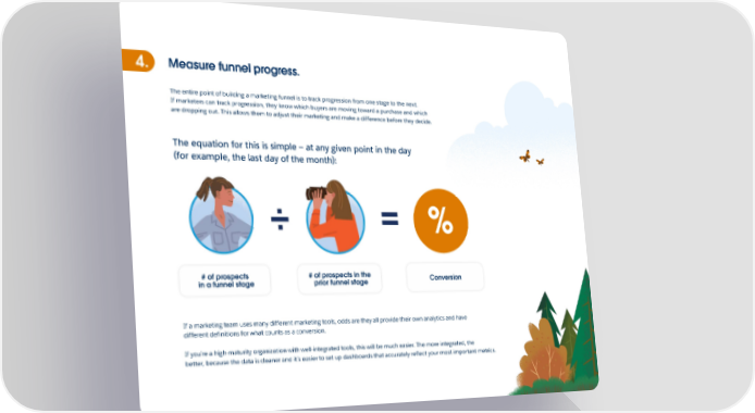 4. Measure funnel progress. The entire point of building a marketing funnel is to track progression from one stage to the next. If marketers can track progression, they know which buyers are moving toward a purchase and which are dropping out. This allows them to adjust their marketing and make a difference before they decide. The equation for this is simple — at any given point in the day (for example, the last day of the month): ÷ = % # of prospects # of prospects in the Conversion in a funnel stage prior funnel stage If a marketing team uses many different marketing tools, odds are they all provide their own analytics and have different definitions for what counts as a conversion. If you’re a high-maturity organization with well-integrated tools, this will be much easier. The more integrated, the better, because the data is cleaner and it’s easier to set up dashboards that accurately reflect your most important metrics.