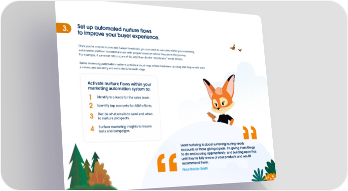 3. Set up automated nurture flows to improve your buyer experience. Once you’ve created scores and funnel thresholds, you can start to use rules within your marketing automation platform to communicate with people based on where they are in the journey. For example, if someone hits a score of 60, add them to the “accelerator” email stream. Some marketing automation systems provide a visual map where marketers can drag and drop emails onto a canvas and set entry and exit criteria for each stage. Activate nurture flows within your marketing automation system to: Identify top leads for the sales team. 1 Identify top accounts for ABM efforts. 2 Decide what emails to send and when 3 to nurture prospects. Surface marketing insights to inspire 4 tests and campaigns. Lead nurturing is about surfacing buying-ready accounts or those giving signals. It’s giving them things to do and scoring appropriately, and building upon that until they’re fully aware of your products and would recommend them. Nout Boctor-Smith