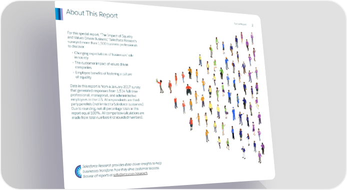 Special Report About This Report 2 For this special report, “The Impact of Equality and Values Driven Business,” Salesforce Research surveyed more than 1,500 business professionals to discover: • Changing expectations of businesses’ role in society • The customer impact of values driven companies • Employee benefits of fostering a culture of equality Data in this report is from a January 2017 survey that generated responses from 1,514 full-time professional, managerial, and administrative employees in the U.S. All respondents are third- party panelists (not limited to Salesforce customers). Due to rounding, not all percentage totals in this report equal 100%. All comparison calculations are made from total numbers (not rounded numbers). Salesforce Research provides data-driven insights to help businesses transform how they drive customer success. Browse all reports at salesforce.com/research.
