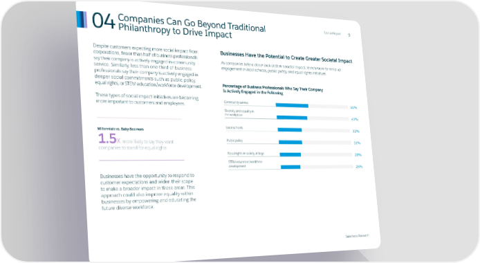 Special Report 04Companies Can Go Beyond Traditional 9 Philanthropy to Drive Impact Despite customers expecting more social impact from Businesses Have the Potential to Create Greater Societal Impact corporations, fewer than half of business professionals say their company is actively engaged in community As companies take a closer look at their societal impact, there’s room to ramp up service. Similarly, less than one-third of business engagement in local schools, public policy, and equal rights initiatives. professionals say their company is actively engaged in deeper social commitments such as public policy, equal rights, or STEM education/workforce development. Percentage of Business Professionals Who Say Their Company Is Actively Engaged in the Following These types of social impact initiatives are becoming Community service more important to customers and employees. 44% Diversity and equality in the workplace 41% Millennials vs. Baby Boomers Local schools 32% 1.5X more likely to say they want Public policy 31% companies to stand for equal rights Equal rights in society at large 28% STEM education/workforce development 26% Businesses have the opportunity to respond to customer expectations and widen their scope to make a broader impact in these areas. This approach could also improve equality within businesses by empowering and educating the future diverse workforce. Salesforce Research