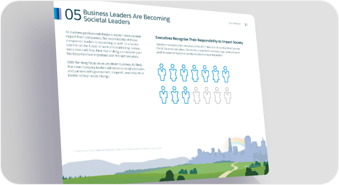 Special Report 05Business Leaders Are Becoming 10 Societal Leaders As business professionals begin to expect more societal Executives Recognize Their Responsibility to Impact Society impact from companies, the responsibility of those companies’ leaders is expanding as well. In a recent Salesforce surveyed senior executives at the 2017 New York Times New Work Summit. summit on the future of work and leadership, senior Out of 14 senior executives, 10 said that compared to two years ago, looking beyond executives said they think that making a societal impact profit to make an impact on society has become more important.* has become more important over the last two years. With the rising focus on values driven business, it’s likely that more company leaders will become social advocates and partners with government, nonprofit, and education leaders to help create change. * Findings from the 2017 New York Times New Work Summit survey, Salesforce Research, Spring 2017. SalesforSalesforcce Re Researesearchch