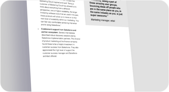 ANALYSIS OF BENEFITS • Improved growth mindset and focus on innovation. Marketing Cloud’s comprehensive, agile toolkit lifted constraints that hampered “The biggest benefit in my innovation in the interviewees’ organizations’ position has been the Trailblazer prior environment. The marketing manager in the Community. Being a part of retail industry described the new mindset that these amazing user groups, Marketing Cloud inspired and said: “Being a bouncing ideas off people who customer of Marketing Cloud has allowed us to think about everything from a different are in the same place as you, in perspective, one of higher scalability. No longer the same industry as you, is just limited by software tools that we used in the past, super awesome.” these products will allow us to move on to that Marketing manager, retail next level of scalability within our marketing. You can feel very comfortable achieving that when you’re using Salesforce.” • Enablement support from Salesforce and partner ecosystem. Several interviewees described robust discovery sessions led by Salesforce implementation partners. The director of product marketing at the finance company found these to be a helpful investment in customer success from Salesforce. They also appreciated the high level of support the customer success manager and Salesforce architect offered. THE TOTAL ECONOMIC IMPACT™ OF SALESFORCE MARKETING CLOUD 24