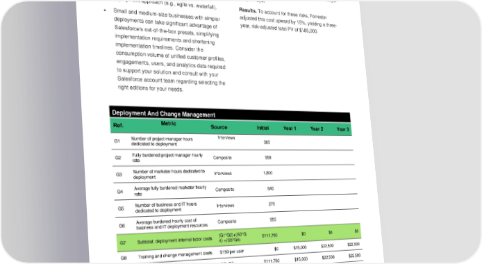 ANALYSIS OF COSTS Risks. Forrester recognizes that these results may • Organizations deploying Salesforce across not be representative of all experiences. The impact multiple geographies will have a longer of this cost will vary depending on: implementation as global stakeholder alignment • The number of Salesforce products implemented, takes longer and there are different global buyer road map, and timing of implementations and journeys. deployment approach (e.g., agile vs. waterfall). Results. To account for these risks, Forrester • Small and medium-size businesses with simpler adjusted this cost upward by 15%, yielding a three- deployments can take significant advantage of year, risk-adjusted total PV of $185,000. Salesforce’s out-of-the-box presets, simplifying implementation requirements and shortening implementation timelines. Consider the consumption volume of unified customer profiles, engagements, users, and analytics data required to support your solution and consult with your Salesforce account team regarding selecting the right editions for your needs. Deployment And Change Management Ref. Metric Source Initial Year 1 Year 2 Year 3 G1 Number of project manager hours Interviews 360 dedicated to deployment G2 Fully burdened project manager hourly Composite $58 rate G3 Number of marketer hours dedicated to Interviews 1,800 deployment G4 Average fully burdened marketer hourly Composite $43 rate G5 Number of business and IT hours Interviews 270 dedicated to deployment G6 Average burdened hourly cost of Composite $50 business and IT deployment resources G7 Subtotal: deployment internal labor costs (G1*G2)+(G3*G $111,780 $0 $0 $0 4) +(G5*G6) G8 Training and change management costs $150 per user $0 $15,000 $22,500 $22,500 Gt Deployment and change management G7+G8 $111,780 $15,000 $22,500 $22,500 Risk adjustment ↑15% Gtr Deployment and change management $128,547 $17,250 $25,875 $25,875 (risk-adjusted) Three-year total: $197,547 Three-year present value: $185,053 THE TOTAL ECONOMIC IMPACT™ OF SALESFORCE MARKETING CLOUD 31
