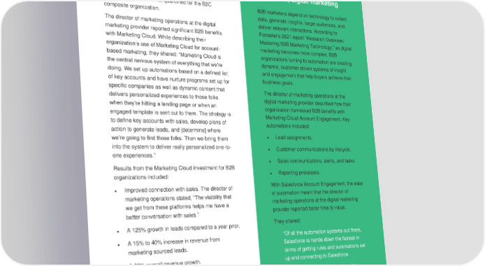 ANALYSIS OF BENEFITS UNQUANTIFIED BENEFITS FOR A B2B Customer Journey: ORGANIZATION Interviewees from organizations that operate in a Director of marketing business-to-business (B2B) model mentioned operations, digital marketing additional B2B benefits that their organizations experienced but were not quantified for the B2C B2B marketers depend on technology to collect composite organization. data, generate insights, target audiences, and The director of marketing operations at the digital deliver relevant interactions. According to marketing provider reported significant B2B benefits Forrester’s 2021 report “Research Overview: with Marketing Cloud. While describing their Mastering B2B Marketing Technology,” as digital organization’s use of Marketing Cloud for account- marketing becomes more complex, B2B based marketing, they shared: “Marketing Cloud is organizations turning to automation are creating dynamic, customer-driven systems of insight the central nervous system of everything that we’re doing. We set up automations based on a defined list and engagement that help buyers achieve their of key accounts and have nurture programs set up for business goals. specific companies as well as dynamic content that The director of marketing operations at the delivers personalized experiences to those folks digital marketing provider described how their when they’re hitting a landing page or when an organization harnessed B2B benefits with engaged template is sent out to them. The strategy is Marketing Cloud Account Engagement. Key to define key accounts with sales, develop plans of automations included: action to generate leads, and [determine] where we’re going to find those folks. Then we bring them • Lead assignments. into the system to deliver really personalized one-to- • Customer communications by lifecycle. one experiences.” • Sales communications, alerts, and tasks. Results from the Marketing Cloud investment for B2B • Reporting processes. organizations included: • Improved connection with sales. The director of With Salesforce Account Engagement, the ease marketing operations stated, “The visibility that of automation meant that the director of we get from these platforms helps me have a marketing operations at the digital marketing better conversation with sales.” provider reported faster time to value. • A 125% growth in leads compared to a year prior. They shared: • A 15% to 40% increase in revenue from “Of all the automation systems out there, marketing sourced leads. Salesforce is hands down the fastest in terms of getting rules and automations set • A 20% overall revenue growth. up and connecting to Salesforce. • A 105% growth in revenue from one product It really helps you connect with sales. through marketing influence. It helps to get better work, to make better campaigns, to make better iterations, and you’re able to do it pretty quickly. There’s really no better B2B marketing automation system.” THE TOTAL ECONOMIC IMPACT™ OF SALESFORCE MARKETING CLOUD 25