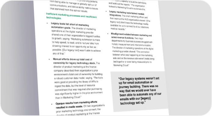 THE SALESFORCE MARKETING CLOUD CUSTOMER JOURNEY The chief marketing officer and their team at the The director of product marketing at the finance HLS company shared the difficulties the company shared: “A lot of the heavy lifting was organization had updating patient lists and on our team to understand the different metrics keeping them separate by location. This posed — they needed someone in an SME [subject several issues, such as patient records often matter expert] capacity to build the definitions being siloed across locations, preventing patients and build out the reports.” The organization from being able to manage or globally opt out of looked to Marketing Cloud to automate this. communications, and deliverability metrics issues • Legacy marketing tools lacked needed that stemmed from the opt-out issues. integrations. The chief marketing officer and Inefficient marketing processes and insufficient their team at the HLS organization shared: “[The technologies. legacy tool] didn’t have the technology readily • Legacy tools fell short of marketing available for us to connect to all our electronic automation goals. The director of marketing medical records.” operations at the digital marketing provider • Misalignment existed between marketing and shared one of their organization’s biggest hurdles sales/revenue functions. Two major to growth, saying: “Marketing automation is there departments for business success struggled with to help speed, to lead, and to nurture folks from holistic measurement and intercommunication. showing interest to an opportunity as fast as The director of marketing operations at the digital possible. [Our legacy tool] wasn’t able to achieve marketing provider shared: “The connection any of that.” between what was happening on the marketing • Manual efforts drove up total cost of side and on the revenue side weren’t really being ownership for legacy technology stack. The tied together or even being measured prior to director of product marketing at the finance Marketing Cloud.” company described their organization’s prior environment’s total cost of ownership for building a robust customer data model, saying, “The tools were good at providing the library of APIs to “Our legacy systems weren’t set ingest the data, but the level of resource up for email automation or commitment that was required after purchasing journey building. There was no was significantly higher in the prior environment way that we would ever have than in Marketing Cloud.” been able to automate any of our • Opaque results from marketing efforts emails with our [legacy] resulted in media waste. Of their organization’s technology set up.” prior marketing technology environment, the Chief marketing officer, HLS director of product marketing at the finance company shared: “The marketing happened in regions, so each region had their own dashboard. It was very hard to get a global view of marketing campaigns.” THE TOTAL ECONOMIC IMPACT™ OF SALESFORCE MARKETING CLOUD 7