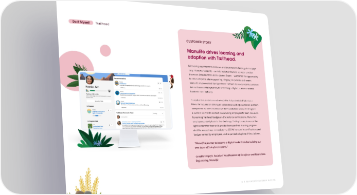 Do it Myself Trailhead CUSTOMER STORY Manulife drives learning and adoption with Trailhead. Motivating your teams to embrace and learn new technology isn’t always easy. However, Manulife – an international financial services provider known as John Hancock in the United States – welcomed the opportunity to drive adoption when upgrading a legacy, on-premise call center. Manulife implemented the Salesforce Platform to modernize its customer interactions on their journey to becoming a digital, customer-centric leader in their industry. To realize this ambition and unlock the full potential of Salesforce, Manulife focused on driving adoption and building up internal platform competencies. With Trailhead as the foundation, Manulife designed a custom six-month contest incentivizing employees to learn new skills by earning Trailhead badges and Salesforce certifications. Manulife’s employees quickly took to the challenge, finding it easy to access the right content for their skills and to showcase their learning progress. And the impact was immediate — a 250% increase in certifications and badges earned by employees, and expanded adoption of the platform. “Manulife’s journey to become a digital leader includes building our own team of Salesforce experts.” -Jonathan Cipryk, Assistant Vice President of Salesforce and Operations Engineering, Manulife 8 SALESFORCE CUSTOMER SUCCESS