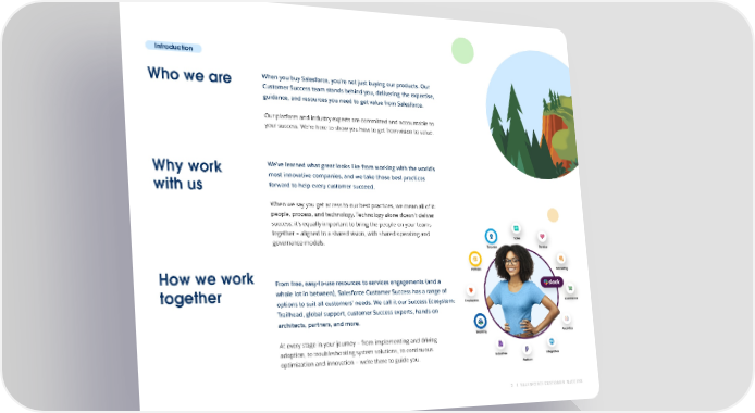 Introduction Who we are When you buy Salesforce, you’re not just buying our products. Our Customer Success team stands behind you, delivering the expertise, guidance, and resources you need to get value from Salesforce. Our platform and industry experts are committed and accountable to your success. We’re here to show you how to get from vision to value. Why work We’ve learned what great looks like from working with the world’s most innovative companies, and we take those best practices with us forward to help every customer succeed. When we say you get access to our best practices, we mean all of it: people, process, and technology. Technology alone doesn’t deliver success; it’s equally important to bring the people on your teams together – aligned to a shared vision, with shared operating and governance models. How we work From free, easy-to-use resources to services engagements (and a together whole lot in between), Salesforce Customer Success has a range of options to suit all customers’ needs. We call it our Success Ecosystem: Trailhead, global support, customer Success experts, hands-on architects, partners, and more. At every stage in your journey – from implementing and driving adoption, to troubleshooting system solutions, to continuous optimization and innovation – we’re there to guide you. 2 SALESFORCE CUSTOMER SUCCESS